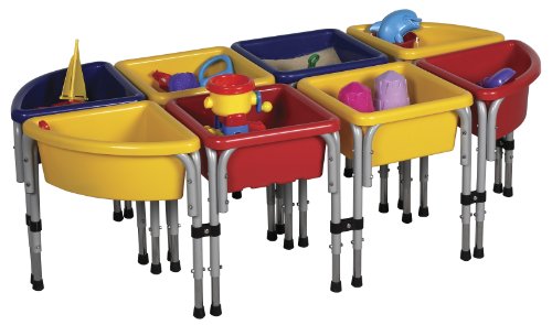 The eight-station Sand & Water Center from ECR4Kids will provide hours of tactile discovery and fine motor play in your childcare facility. Eight colorful, pie and square-shaped bins can hold water, sand and small toys. The sturdy steel legs have ABS feet and can adjust to accommodate children of multiple ages. Each bin comes with a clear cover to keep contents clean and contained.Key Features Eight bins with clear covers Adjustable legs with ABS feet Stations can be configured in several waysSpecifications Suggested age range: Three years and up Bin material: Polypropylene Leg material: Powder-coated steel Leg Heights: 20", 22 1/2" or 26" Width: 59 1/2" Depth: 29 3/4" Assembly required Warranty: One year